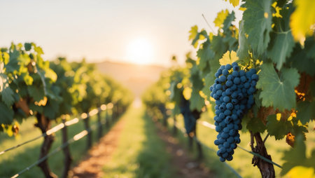 Ripe grapes growing in neat rows across a vineyard, soaking up the warm, golden light of the hour just before sunset