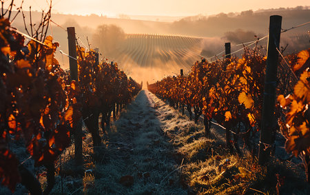 Beautiful autumn vineyard landscape with vibrant yellow and red leaves, showcasing misty morning atmosphere and frost-covered ground. Harvest and nature concept.
