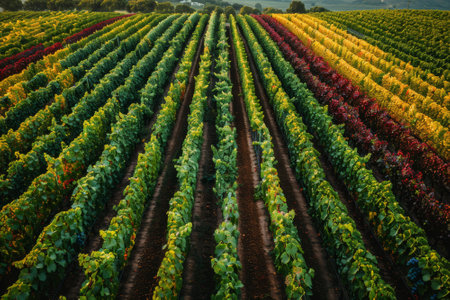Drone view of vineyards transitioning from summer to autumn, rows of grapevines changing color. AI generated.