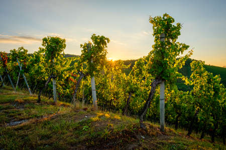 Sunset over a vineyard in Traisen, Germany