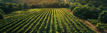 Aerial view of a vibrant vineyard at sunset, showcasing neatly arranged rows of grapevines glowing in the golden light with lush surroundings and a serene atmosphere.