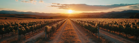 Serene sunset over rolling vineyard rows, bathed in the warm glow of golden hour. Picturesque landscape showcasing vibrant grapevines and idyllic wine country scenery. Perfect for wine label, travel brochure, or representing the harvest season.