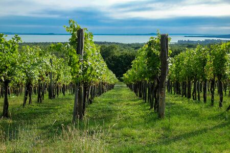 Rows of green wine grapes with lake and sky view