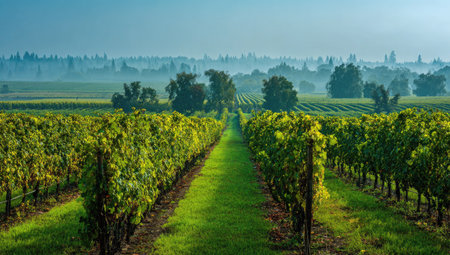 The first rays of the sunrise illuminate a lush vineyard, with rows of grapevines standing tall amidst the pastoral beauty of the countryside.