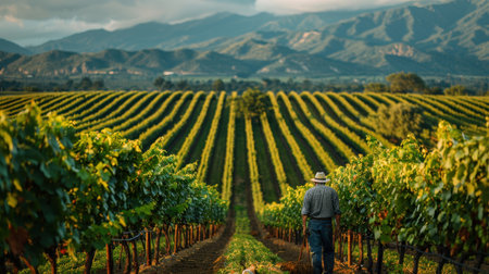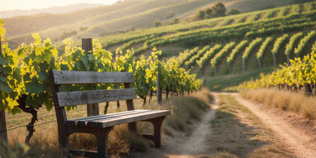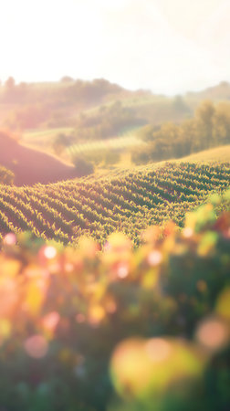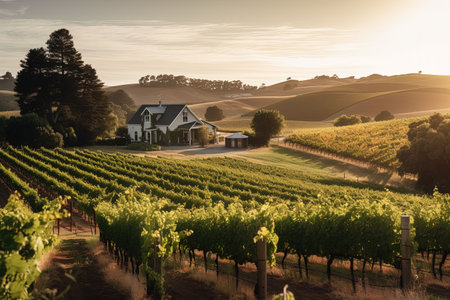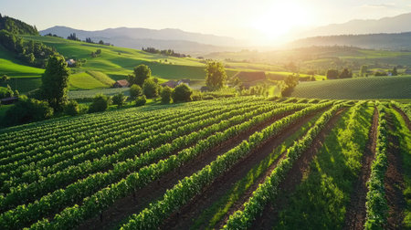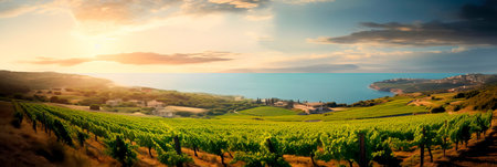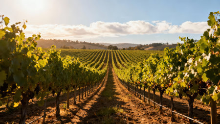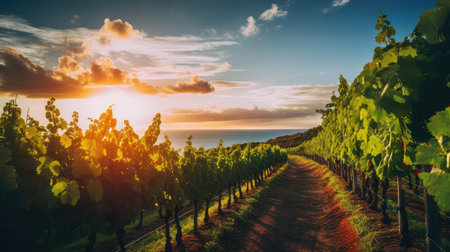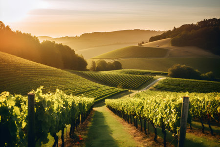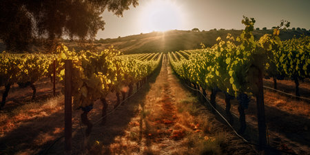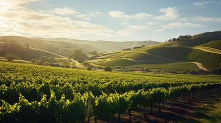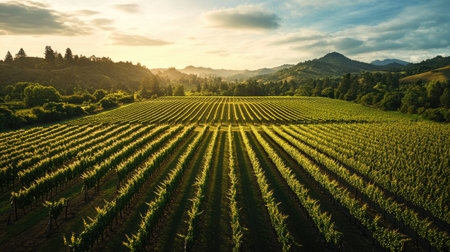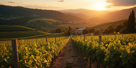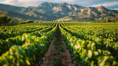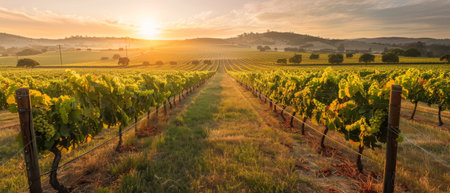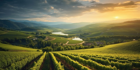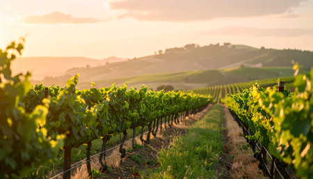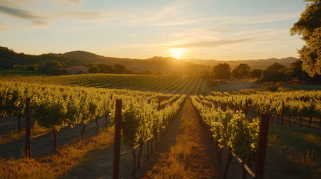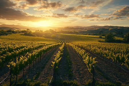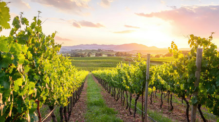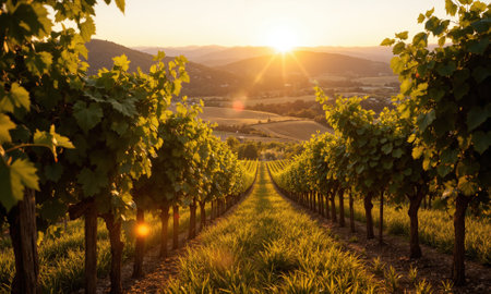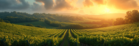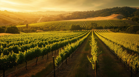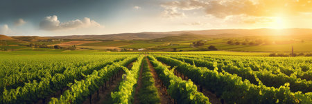 Scenic vineyard with grapevines and sunset light for wine and luxury lifestyle advertising. Rows of lush grapevines stretch across rolling hills, illuminated