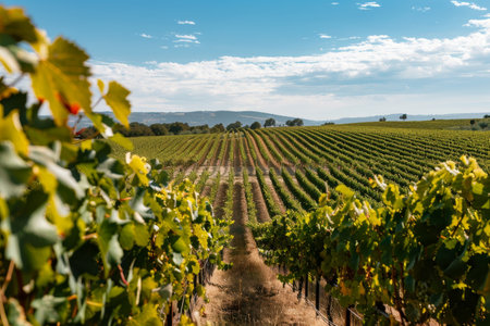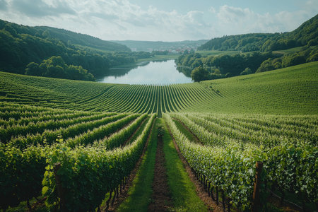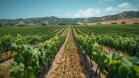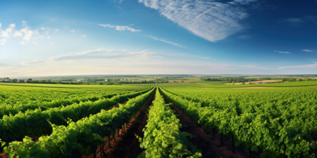 This image showcases a scenic vineyard with rows of grapevines. The vibrant green foliage is contrasted by the blue sky. The composition emphasizes symmetry and depth, creating a visually appealing landscape. This image is suitable for a variety of uses, including editorial and commercial purposes.