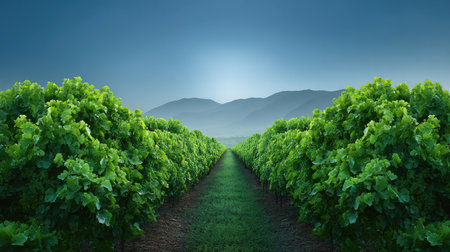 Discover a tranquil vineyard landscape featuring lush green vines under a clear blue sky, with majestic mountains in the background, evoking serenity and natural beauty.