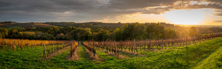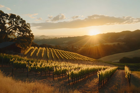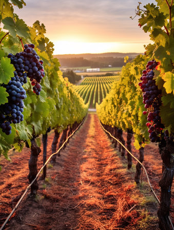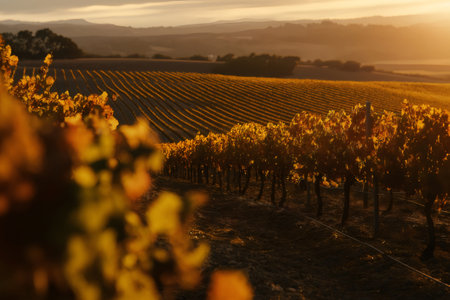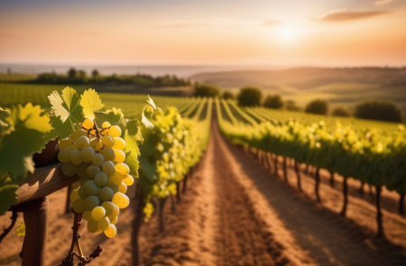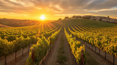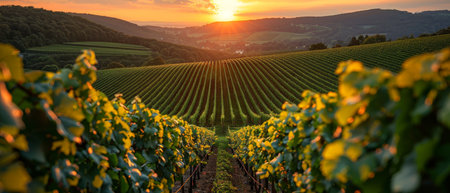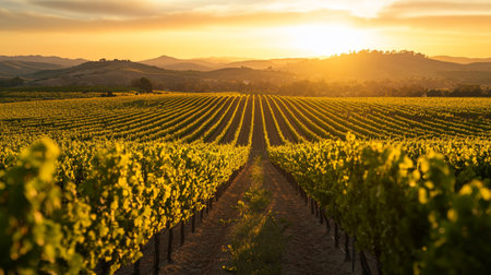 Serene sunset over rolling vineyard rows, bathed in the warm glow of golden hour. Picturesque landscape showcasing vibrant grapevines and idyllic wine country scenery. Perfect for wine label, travel brochure, or representing the harvest season.