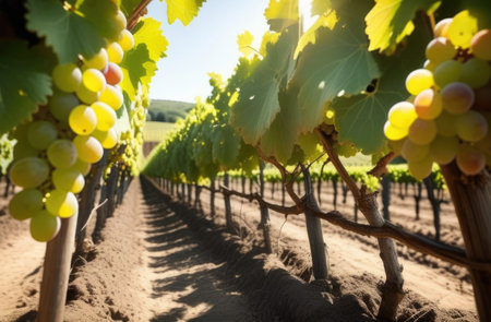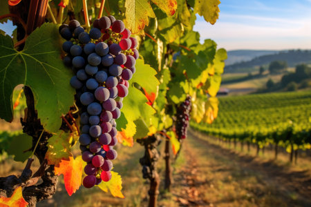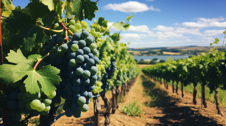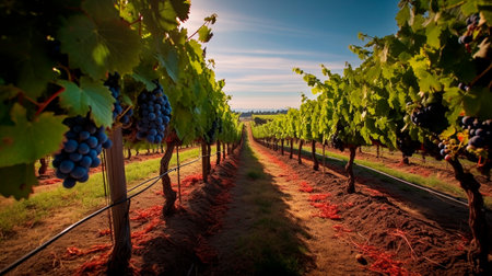 ripe grapes on the vine, bathed in sunlight, with the backdrop of a lush vineyard stretching into the distance. Generative AI