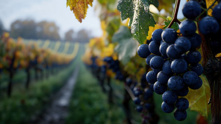 Autumn harvest in a vineyard lush green fields and dark blue grapes under sunlit skies
