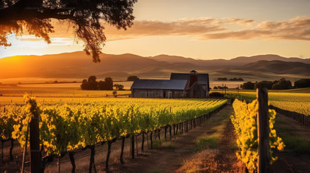 A Majestic Sunset Graces the Vineyard, Mountains, and Barn in the distance. Generative AI