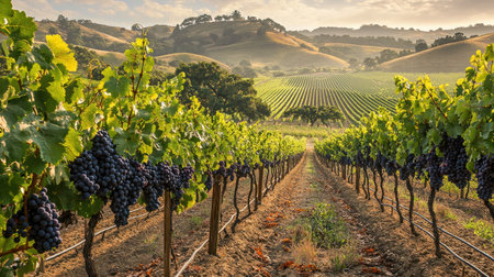 A lush vineyard with ripe grapes hanging from vines, showcasing rolling hills in background