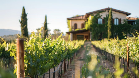 An AI-generated illustration of an idyllic countryside house in the midst of a flourishing vineyard.