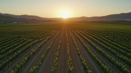 A stunning sunset illuminates a vast vineyard, showcasing endless rows of flourishing green vines. The tranquil scene captures the beauty of rural agriculture.