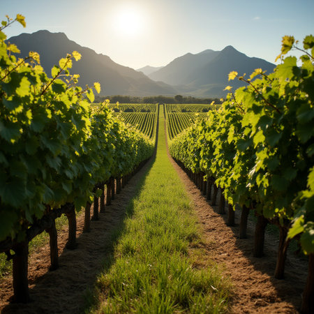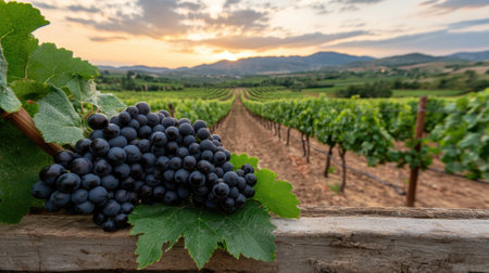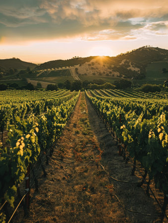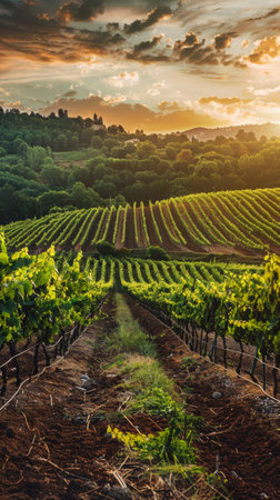 Scenic vineyard with grapevines and sunset light for wine and luxury lifestyle advertising. Rows of lush grapevines stretch across rolling (1)