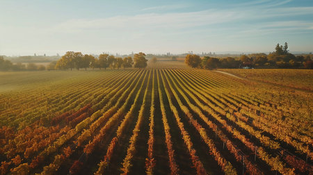 Warm sunlight bathes rows of grapevines in a vineyard, creating a picturesque autumn scene