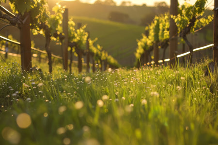Sun-kissed vineyard practicing sustainable winemaking, with rows of budding grapevines. Dew on the grass captures the last rays of the sun, highlighting the eco-conscious approach to viticulture