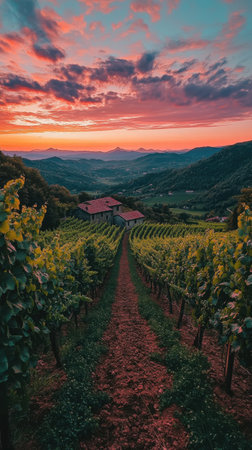 A vibrant sunset fills the sky with warm hues as it sets over the expansive vineyards. Rows of grapevines stretch out towards a charming farmhouse nestled in the hills.