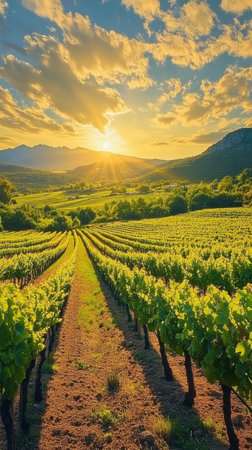 A picturesque vineyard landscape bathed in warm sunlight during sunset, showcasing lush green rows of grapevines and a serene rural environment.