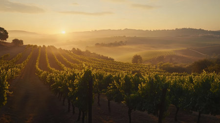 Golden sunlight spills over a tranquil vineyard in the morning, illuminating lush grapevines under a misty sky. The serene landscape invites peace and reflection.