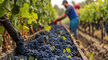 Farmers harvest ripe grapes in a vineyard under warm sunlight, showing the beauty of nature and the labor of love during grape picking season.