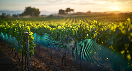 A breathtaking view of a vineyard at sunset, showcasing vibrant green vines stretching towards the horizon, bathed in warm, golden light of the evening sun.