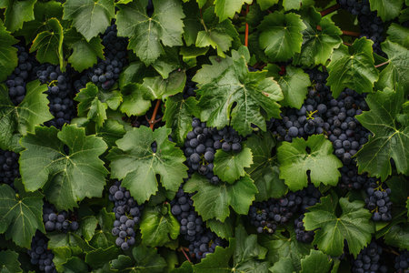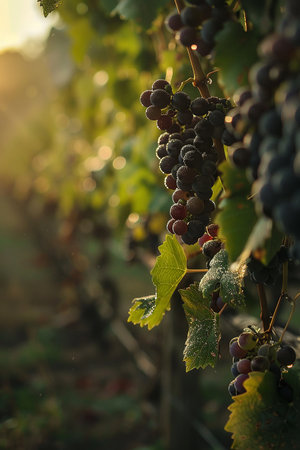 An exquisite photo ideal for use in travel guides, culinary publications, or wall art for wine enthusiasts | This image showcases a serene vineyard at sunset, with a close-up of plump grape clusters in the foreground, invoking thoughts of fine winemaking and the agricultural beauty of vineyards. The sun's warm glow, filtering through the leaves and ripe grapes, creates an almost ethereal backdrop, emphasizing the lushness of the vines and the richness of the grape's colors, ranging from deep blues to subtle purples. This tranquil scene perfectly captures the romance and tradition associated with viticulture and winemaking. The bokeh effect blurs the vines in the distance, allowing the viewer to focus on the grapes' detailed texture and their connection to the earth. The soft lighting conditions enhance the natural vibrancy of the grape skins and add a sense of depth to the foliage. The overall composition symbolizes the harmonious relationship between nature and nurture, the patience required in growing and harvesting, and the onset of the harvest season | This compelling image serves a dual purpose; it not only celebrates the picturesque beauty of the wine country but also acts as an emblem of the time-honored process that gives rise to some of the world's finest wines. It would complement editorial content exploring agritourism, the art of winemaking, or pieces focused on the experience of rural tranquility. In a more commercial light, it's a fitting promotion for vineyard tours, wine tasting sessions, and connoisseur events, as well as an authentic representation of terroir in marketing for wineries and wines | a beautifully composed photograph of a vineyard at sunset with a detailed capture of grape clusters and an inviting backdrop that promotes the allure of wine crafting and vineyard culture under a natural, golden hour ambiance, offering space for text and design elements