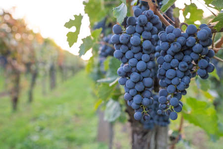 Ripe grapes in a vineyard in the sunlight at sunset.