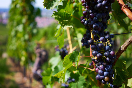 Landscape of vineyard with ripe red wine grapes on sunny day