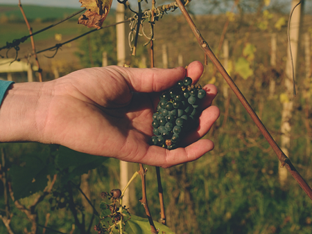 Beautiful healthy bunch of grapes, autumn harvest of vines.