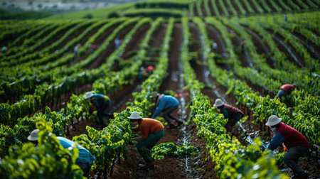 Harvest season brings workers together in a vineyard as they pick ripe grapes under the warm glow of the setting sun.