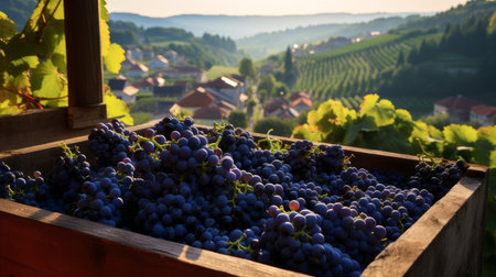 A stunning view of freshly harvested grapes in a wooden crate, set against a breathtaking sunset in a vineyard. Experience the tranquility of nature.