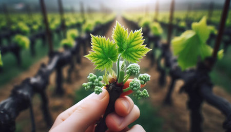 ripe grapes on the vine, bathed in sunlight, with the backdrop of a lush vineyard stretching into the distance. Generative AI