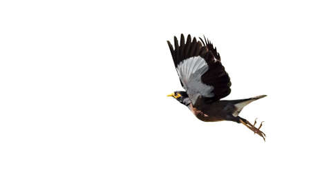 Closeup Mynah Bird Flying in The Air Isolated on White Background, Clipping Path
