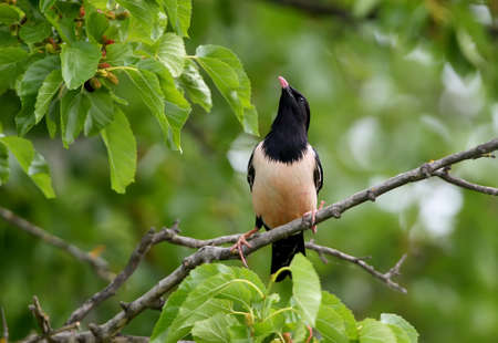 Rose-colored starling, Sturnus roseus, single male sits on a wire with an open beak.