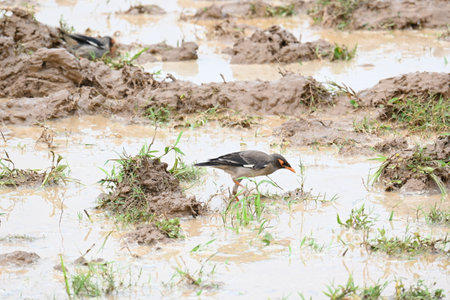 Indian Myna Birds in water filled field. It is searching for food in water filled mud. Its other names are Common myna and mynah. This is a bird of the starling family Sturnidae.