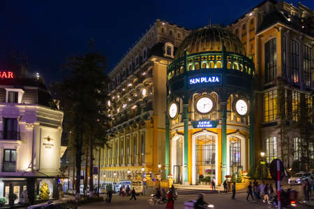 Sapa, Vietnam, Oct 09, 2018 Sapa Sun Plaza old building architecture, art deco beautiful design in town square, shopping mall and funicular station at night