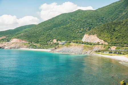 Tropical seascape with turquoise sea, white clouds in the sky, beautiful view of mountains, Asia, Vietnam