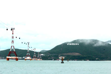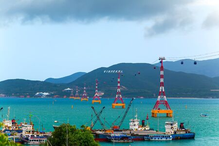 NHA TRANG, VIETNAM - FEB 12, 2015: Cable car tower to Vinpearl Amusement Park Island cableway long rope road on water bay Nha Trang, Vietnam