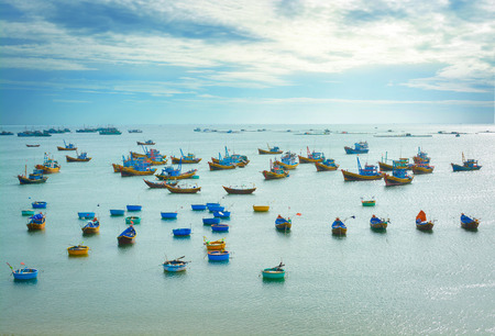 Mui Ne, Vietnam - Feb 23, 2017. Fishing boats docking on the sea in Binh Thuan, Vietnam. Binh Thuan Province is known for its beaches and coastal roads.