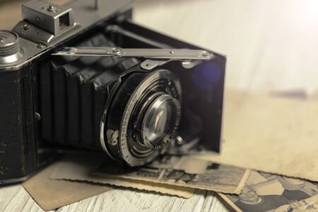 Old retro vintage camera photography copyspace. Obsolete nostalgia style.