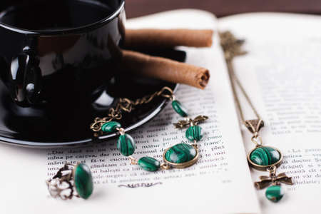 An exquisite display of antique jewelry featuring a detailed necklace and earrings on lush emerald satin fabric, adding elegance and opulence to any setting.