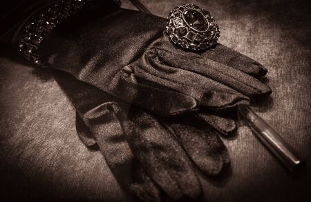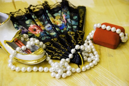 Fashionable and vintage accessories on a table: leopard print scarf, wooden handbag, cat eye sunglasses, pearl barette and gold rings. Selective focus.