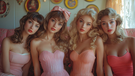 A dreamy image featuring four beautiful women in chic dresses and heels posing together in a vintage-style setting. Each exudes elegance and poise, radiating a classic timeless beauty.