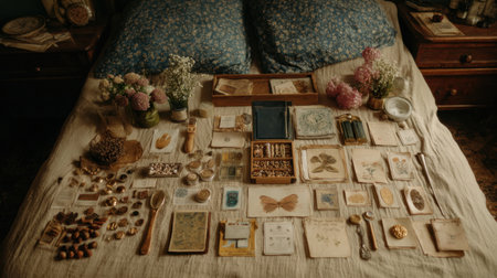 A cozy and artistic display of vintage artifacts, flowers, and natural elements, creating a warm and inviting atmosphere ideal for inspiring creativity and reflection.