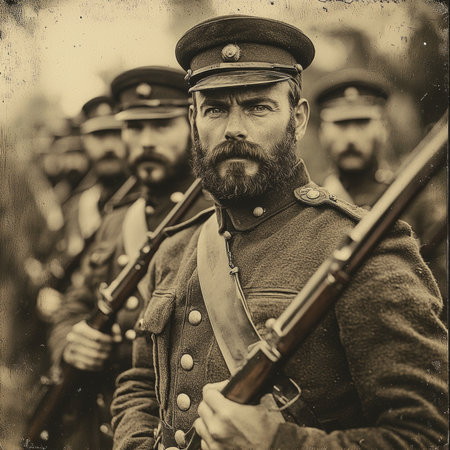 Brave soldiers from the First World War strike a proud pose with their rifles showcasing their uniforms in a vintage setting reflecting their camaraderie and commitment.