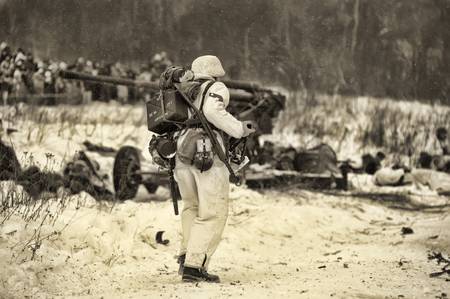 Member of Red Star military history club wears historical German uniform during historical reenactment of WWII. Historical military reenacting in Chernigow, Ukraine