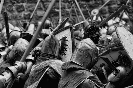 Medieval battle scene with cavalry and infantry. Selective focus.