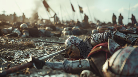 Medieval knight in armor on the battlefield. Selective focus.