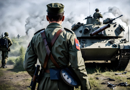 War, battlefield of enemy armies with soldiers and equipment, military special operation